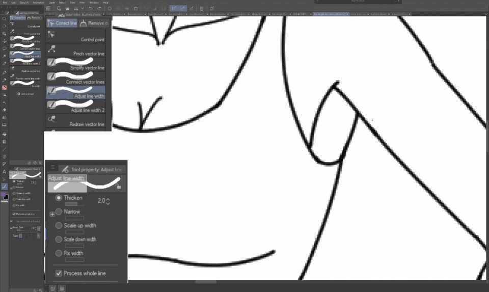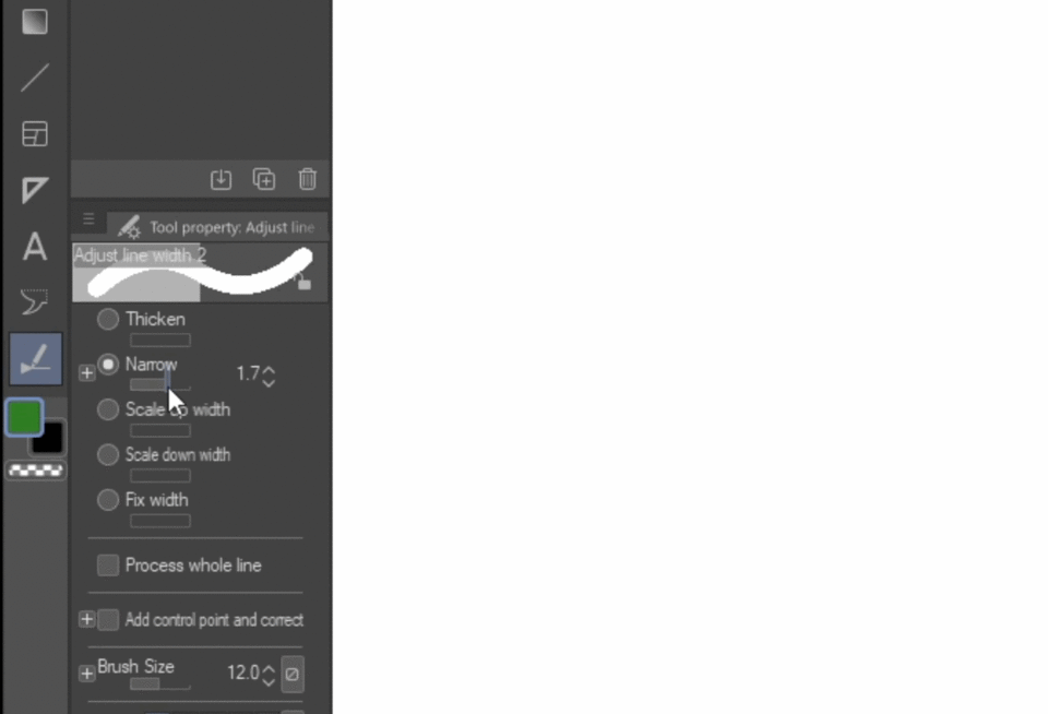 La quatrième façon est d'utiliser les fonctions d'expansion ou de pincement de l'outil Déformation fluidité. Utilisez le sous-outil d'expansion si vous voulez épaissir la ligne ou l'outil de pincement pour affiner la ligne. Faites attention à ne pas en abuser car la résolution de la ligne se dégradera.