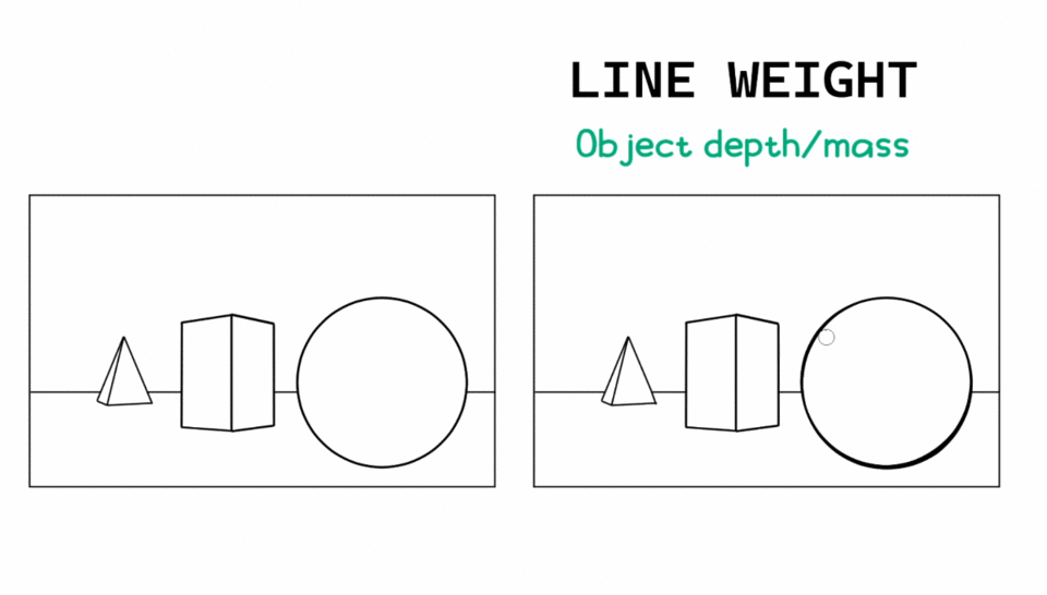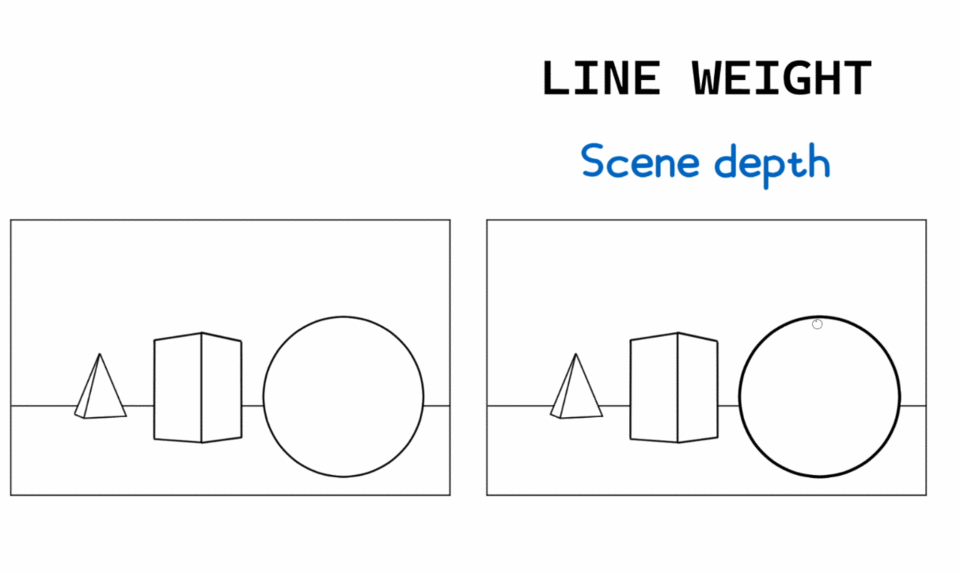 L'épaisseur de ligne peut être utilisée pour représenter la profondeur d'une scène. Essentiellement, il suffit d'épaissir les lignes des éléments les plus proches du spectateur et d'affiner les lignes de ceux qui sont plus éloignés pour créer un sentiment de profondeur spatiale.