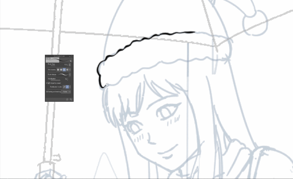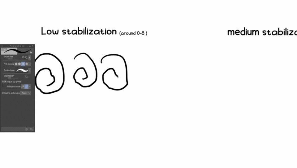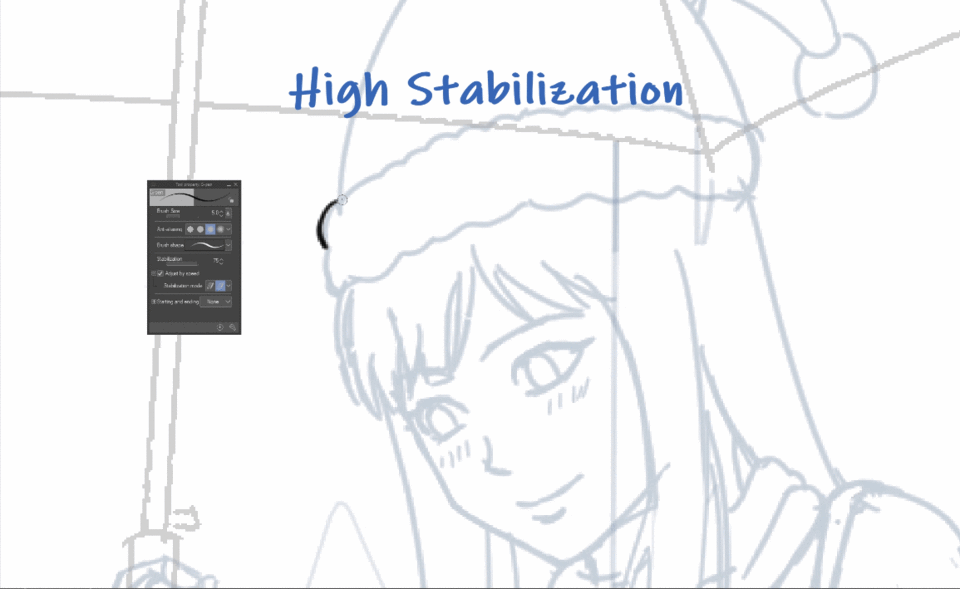 La stabilisation moyenne est un réglage communément préféré par la plupart des artistes. J'utilise également la stabilisation moyenne la plupart du temps dans mes dessins. Elle fonctionne très bien pour dessiner des personnages, des animaux, et globalement toutes les formes organiques qui impliquent beaucoup de courbes. Dans cet état, vous pouvez obtenir des lignes effilées décentes, et il y a un léger délai dans le dessin, ce qui est généralement acceptable.