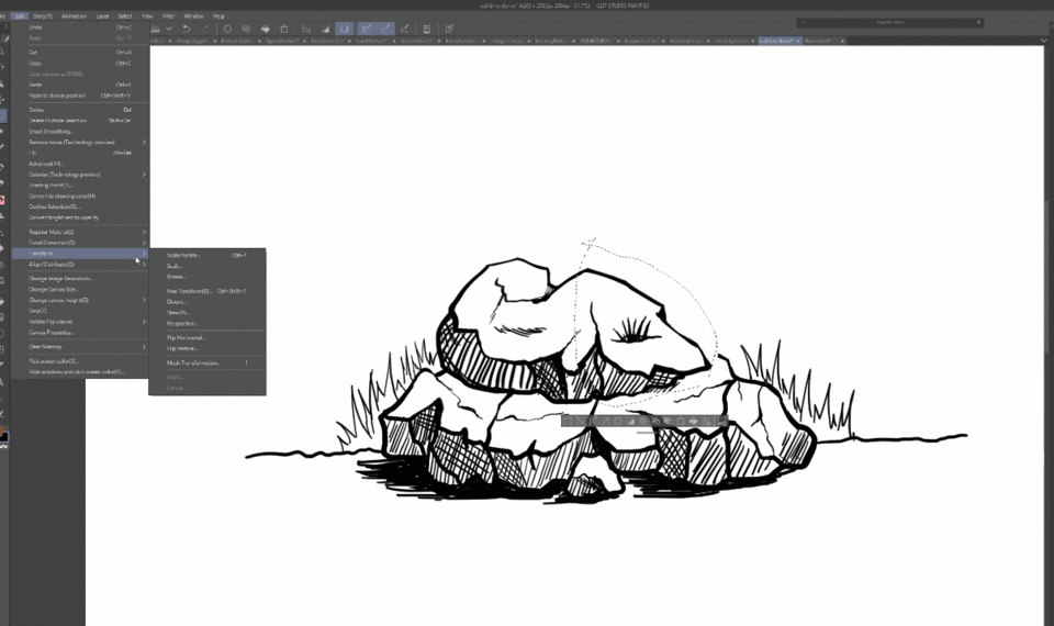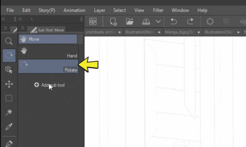 Appuyez sur 'R' pour faire pivoter ou sélectionnez le sous-outil 'Rotation' de l'outil 'Déplacer'. Tous les angles des lignes que nous dessinons ne sont pas naturels. Il peut être difficile de dessiner sous certains angles car cela peut aller à l'encontre du mouvement naturel de notre poignet et de notre épaule. La rotation de la toile vous permet de trouver un angle plus confortable pour dessiner et parfois même de mieux visualiser les choses sous un angle différent.