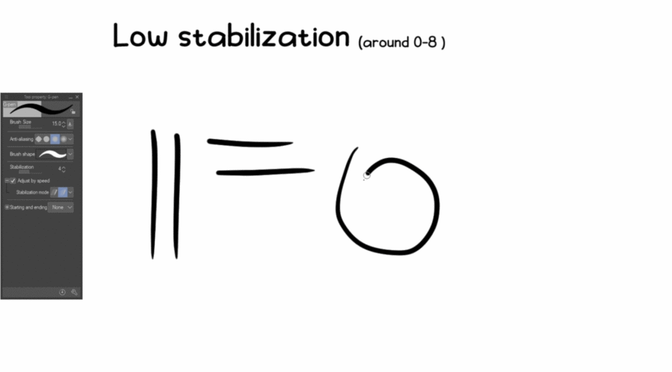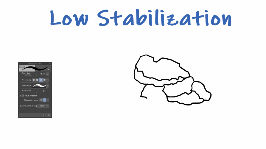 Premièrement, elle corrige automatiquement les tremblements de chaque ligne lorsque vous dessinez. Si vos lignes apparaissent tremblantes et irrégulières, augmenter la valeur de stabilisation corrigera la ligne tremblante, ce qui donnera des lignes plus lisses et plus fluides. Plus la valeur de stabilisation est élevée, plus vos lignes seront lisses.
