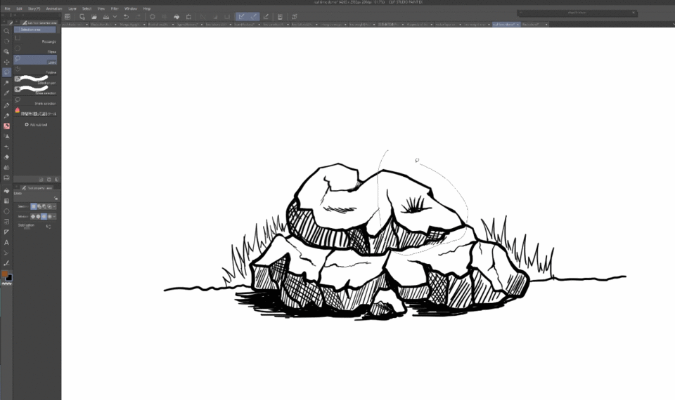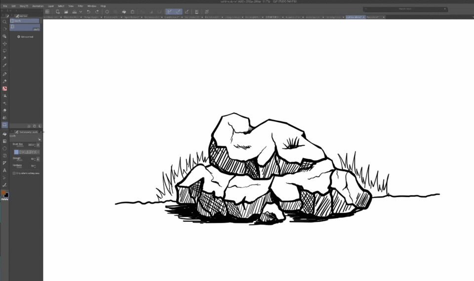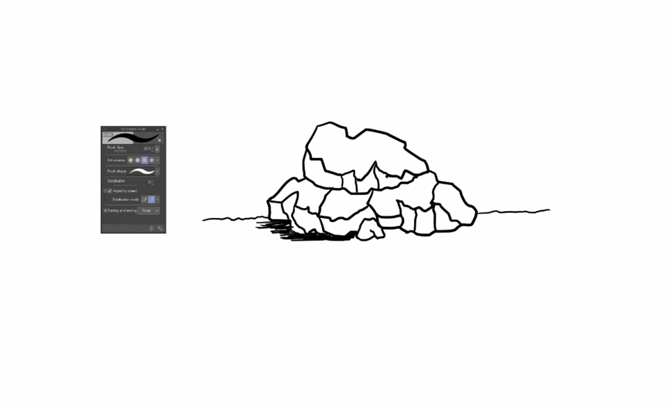 En faible stabilisation, il est plus facile de tracer des lignes tremblantes, et il n'y a presque aucun délai dans cet état. C'est particulièrement bénéfique pour l'illustration d'environnements naturels comme les rochers, les arbres et les textures. Une touche d'irrégularité peut ajouter une sensation plus naturelle à votre travail dans de tels cas. Bien qu'obtenir des lignes effilées soit plus difficile dans cet état, vous pouvez simplement réduire la taille du pinceau pour tracer une ligne effilée ou effacer l'épaisseur de la ligne. Si vous dessinez sur un calque vectoriel, une astuce utile est d'utiliser l'outil 'Ajuster la largeur de ligne' pour effiler la ligne. Je couvrirai plus en détail ces fonctionnalités plus tard.