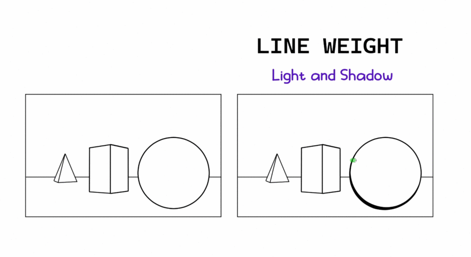 L'épaisseur de ligne peut être utilisée pour transmettre une sensation de lumière et d'ombre. Si la source de lumière provient du côté droit, vous pouvez épaissir les lignes du côté gauche pour indiquer l'ombre. Inversement, vous pouvez utiliser des lignes plus fines, ou même rompre la ligne, pour suggérer où la lumière frappe.