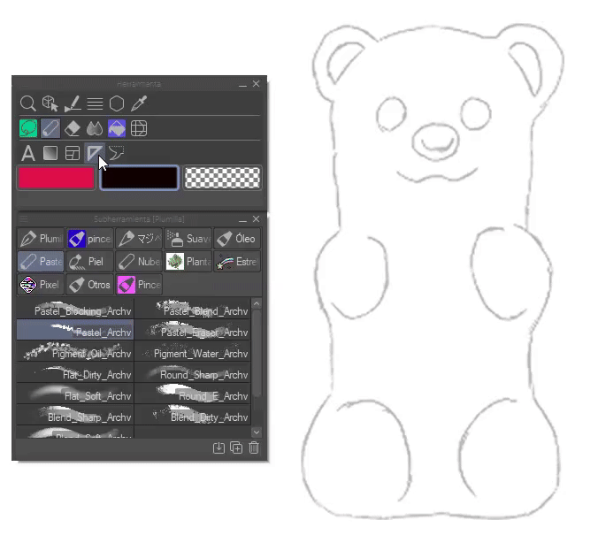 On dit que l'important est la technique, pas les matériaux, et c'est vrai, mais les pinceaux sont un bon soutien pour faciliter la simulation des textures. Personnellement, j'aime les pinceaux granulés. Les pinceaux que j'ai utilisés dans les illustrations de ce TIPS sont :