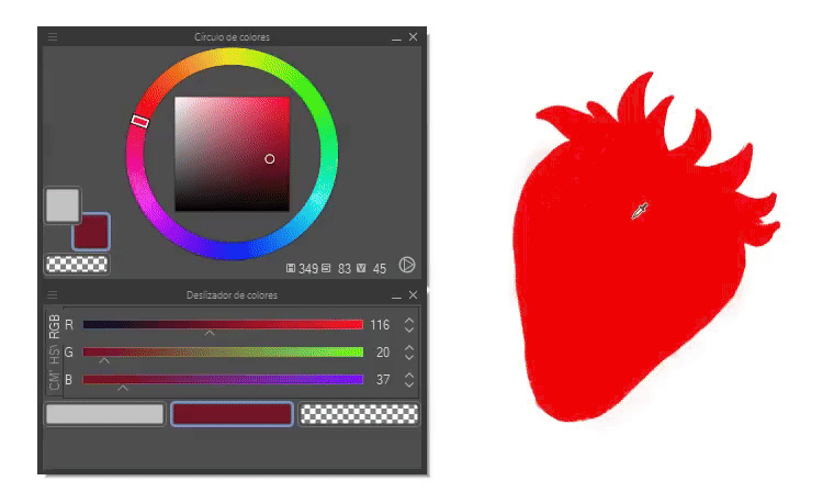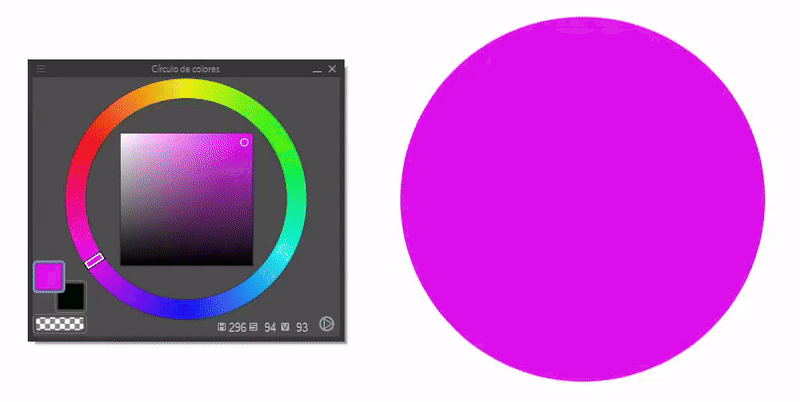 Un outil que nous pouvons utiliser à ces fins est : « Curseur de couleurs ». Cet outil permet d'extraire la luminosité, la saturation ou les tons d'une couleur sélectionnée dans le cercle chromatique. La première icône de couleur correspond à la couleur primaire, la seconde à la secondaire et la troisième à la transparence (si le pinceau est utilisé, il agit comme une gomme).