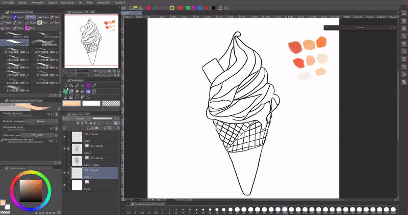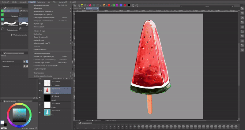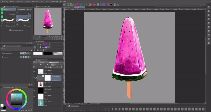 Nous commençons par placer les couleurs de base, la beauté de ce type de friandise est sa surface froide, pour la simuler, nous utiliserons des couleurs claires et nous marquerons la tridimensionalité de l'objet ; dans le cas de la pastèque, elle a une face qui n'est pas visible, mais nous la marquerons un peu.