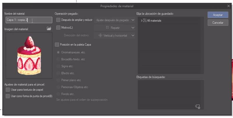 Une fenêtre apparaîtra où nous mettrons le nom du matériau, son emplacement dans le programme et, le plus important, il faudra cocher la case « Utiliser comme forme de pointe de pinceau ». Lorsque nous aurons tout, nous cliquerons sur accepter.