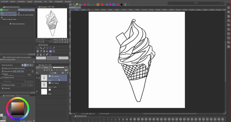 Pour l'utiliser, il faudra créer un calque en dessous du lineart où la figure sera remplie ; ensuite, en restant sur le calque de remplissage, nous marquerons le calque du lineart comme calque de référence (icône du phare).