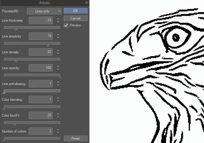 Augmentez l'Opacité de la ligne au maximum. Les autres réglages - Épaisseur, Simplicité, Densité et Anti-crénelage - dépendront tous de la taille et des détails de votre image, alors ajustez-les jusqu'à obtenir un line art qui vous convienne.