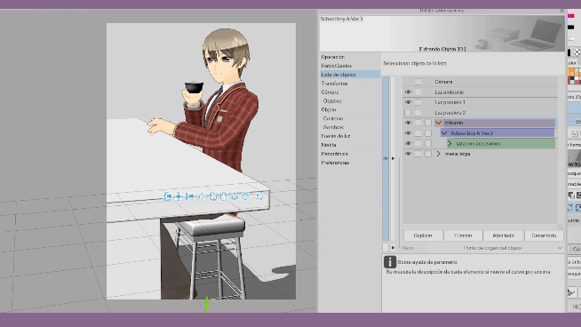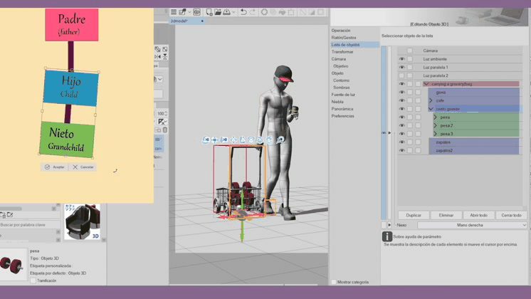 Dans ce cas, j'ai utilisé le tabouret comme point d'axe ou « parent » pour déplacer mon personnage qui deviendrait l'« enfant ». Comme vous pouvez le voir, les objets peuvent également être attachés aux modèles 3D, mais ils n'ont pas de points d'articulation. Cela peut être utile pour les utiliser sur des meubles ou des chaises, des automobiles, lorsque notre modèle 3D doit rester fixe sur cet élément.