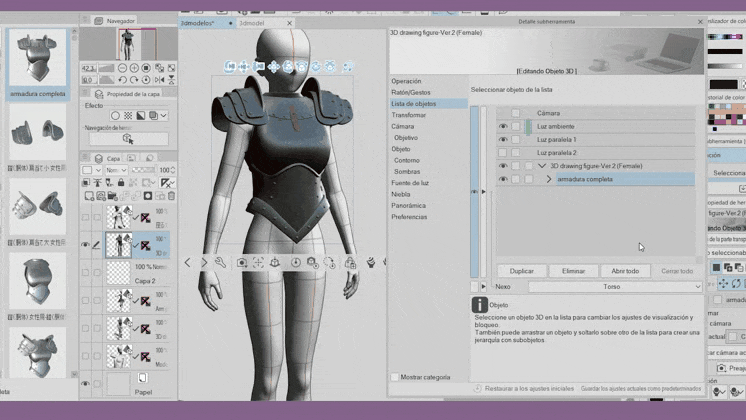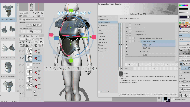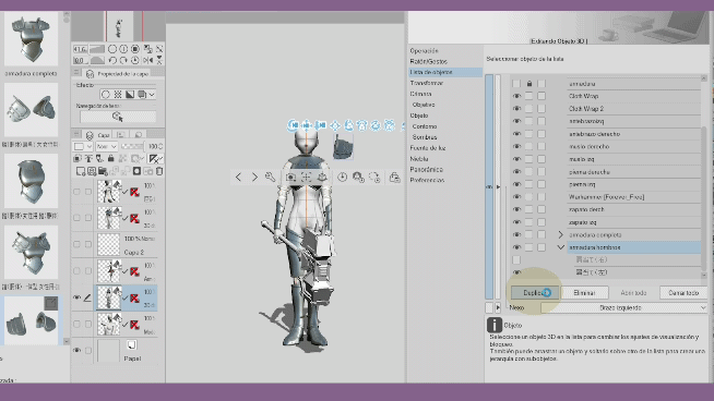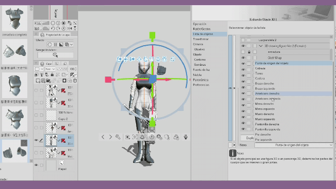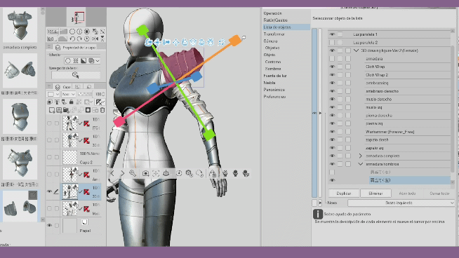 Dans les matériaux 3D, on peut trouver d'autres sous-éléments de l'élément correspondant, qui se déploient avec la petite flèche. Nous pouvons les visualiser en activant les yeux de chaque élément. Bien que les matériaux contenant d'autres sous-éléments soient utiles pour modéliser nos personnages, et qu'ils fonctionnent ensemble grâce à la hiérarchie, au moment d'appliquer une autre pose, comme vous pouvez le voir, la partie des épaules de l'armure est statique et ne suit pas le mouvement des bras.