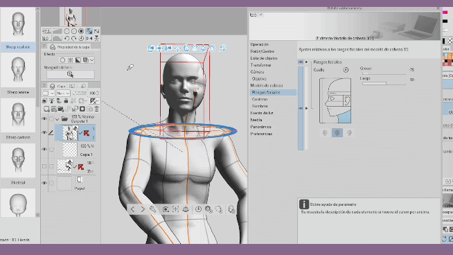 L'étape suivante consiste à sélectionner la tête 3D, aller à → « traits du visage », sélectionner la partie du cou, vous pouvez modifier la longueur, mais la largeur est le plus important, vous pouvez donc diminuer l'épaisseur à votre préférence, dans mon cas je l'ai laissée à -75.