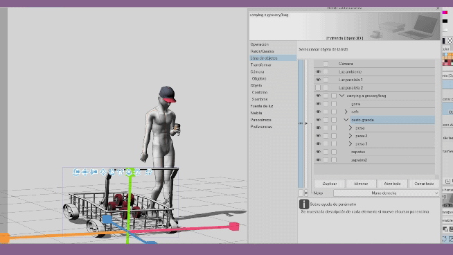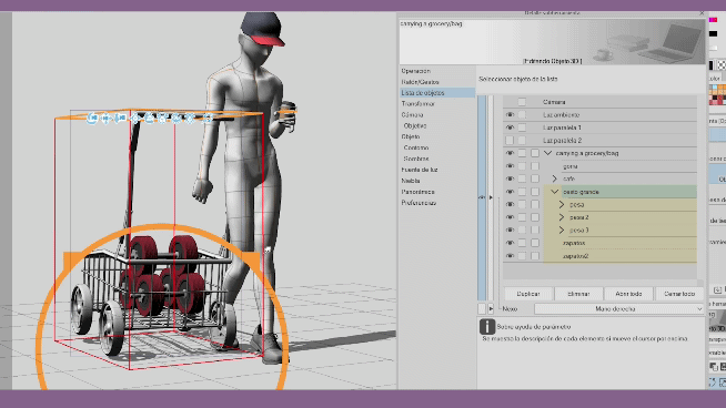 Remarque : Les éléments qui ne font pas partie de la hiérarchie ne bougeront pas. Exemple : le cas de l'objet « poids » qui est en dehors de la hiérarchie de l'objet « grand panier ».