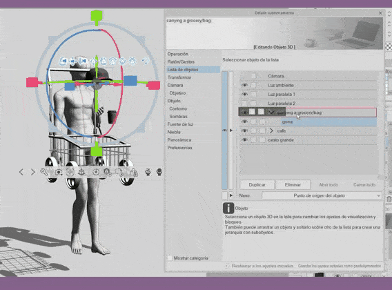Les matériaux 3D qui appartiennent à une hiérarchie, lorsqu'ils sont agrandis avec le cercle gris, sont affectés en même temps. Dans ce cas, le panier est l'« enfant » qui contient les poids, qui seront les « petits-enfants ».