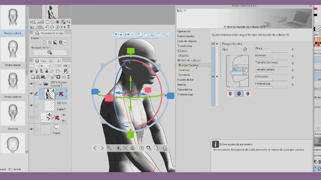 Une fois la tête ajustée à l'aide des hiérarchies, nous allons sélectionner le modèle 3D et aller à « figure 3D » et ajuster la tête vers la gauche et vers le bas. Ensuite, nous allongeons le cou. Et si nécessaire, nous ajustons la tête.