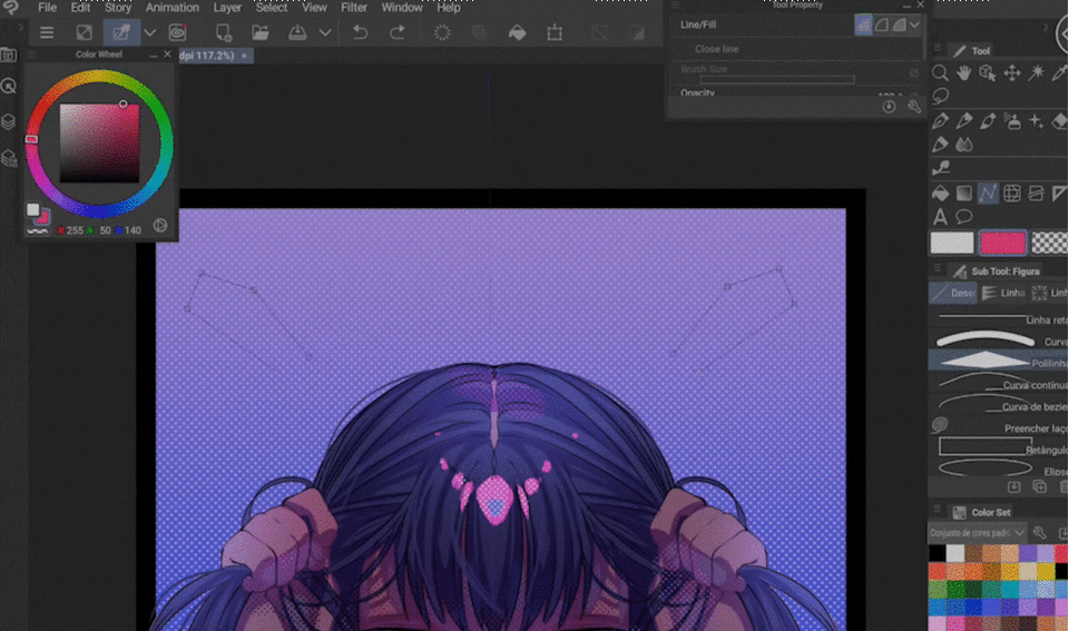 Le style sera certainement la partie la plus amusante du processus, car nous avons une infinité d'options à essayer. Mais d'abord, rendons l'illustration avec une simple technique de cell shading ; généralement, en ce qui concerne l'art anime rétro, les détails ne sont pas très fins, ils paraissent solides, ressemblant plus à une case d'anime qu'à une œuvre entièrement rendue.