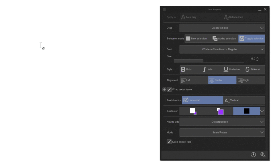 En tapant "T" sur le clavier ou en sélectionnant simplement le "A" (icône de texte) dans la "palette d'outils", vous ouvrirez la fonctionnalité de texte dans la "propriété de l'outil".
