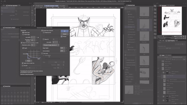 La dernière étape consiste à convertir un objet 3D en personnage. Le moyen le plus simple est de simplement rastériser le calque 3D et de tracer l'objet par-dessus. Vous pouvez également extraire les lignes et les tons à l'aide des fonctionnalités intégrées de Clip Studio Paint.Sélectionnez le calque avec la figure 3D et faites un clic droit dessus. Dans le menu, sélectionnez Convertir en lignes et tons. Vous pouvez extraire les lignes au format vectoriel ou raster, ajuster l'épaisseur et la précision de détection des lignes.
