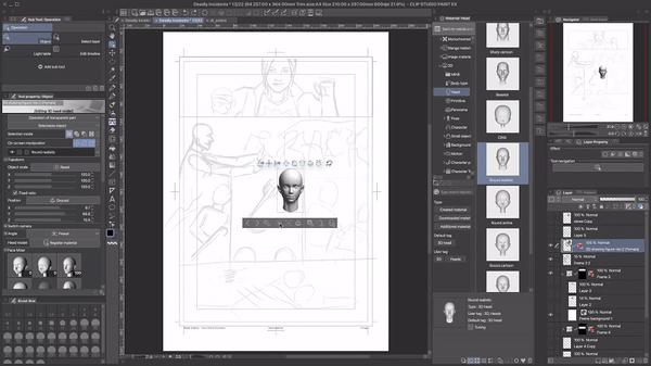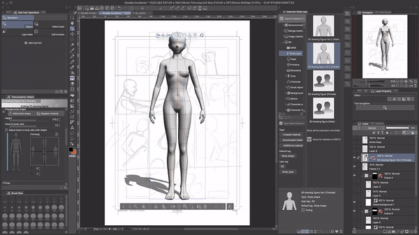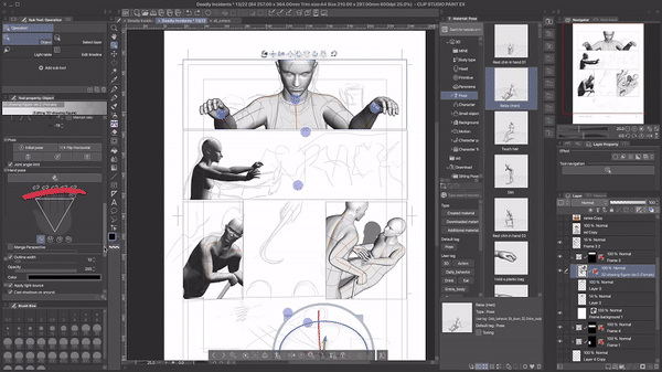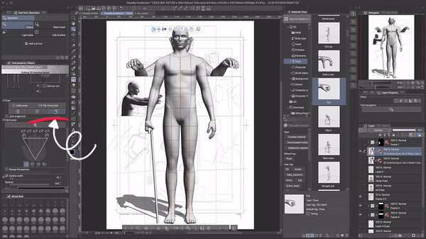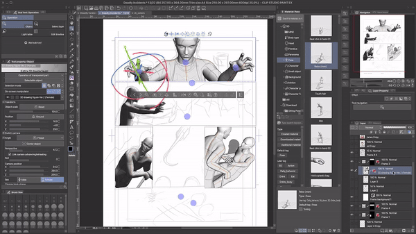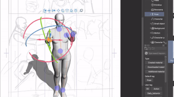 Puisque nous avons déjà fait beaucoup de travail de préparation, nous pouvons nous détendre un peu ici et utiliser des poses standard de la boutique de ressources. La tête et le corps seront posés automatiquement. Nous n'avons pas besoin de changer quoi que ce soit manuellement.J'ai deux conseils ici : premièrement, commencez à poser le personnage 3D en dehors du cadre de la bande dessinée/du webtoon. Vous pourrez toujours déplacer le calque plus tard, mais de cette façon, vous aurez plus de contrôle et pourrez mieux voir les choses.Le deuxième conseil est de partir de la pose existante la plus proche de votre résultat souhaité. Les modèles de personnages 3D dans Clip Studio Paint sont super flexibles, vous pouvez pratiquement ajuster chaque angle et même briser l'anatomie et les lois de la physique en le faisant.