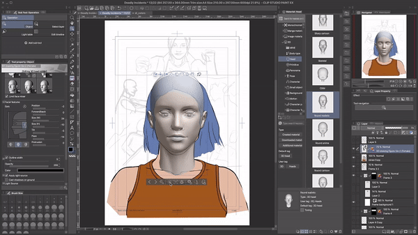 Clip Studio propose plusieurs têtes utiles pour différents styles de dessin,vous pouvez également combiner plusieurs têtes en une seule pour créer celle qui convient parfaitement à votre personnage.La création de la tête est assez similaire à la création d'un corps : il suffit de sélectionner n'importe quelle caractéristique et d'ajuster les paramètres jusqu'à ce que vous soyez satisfait des résultats. Si vous n'êtes pas sûr de ce que modifie un paramètre spécifique ou si vous ne voyez aucune différence en vue de face,il peut être utile de passer en vue latérale. Surtout, lorsque vous modifiez les paramètres du nez et des oreilles, cela peut paraître très bien de face mais vraiment bizarre de côté. Vous pouvez également modifier les côtés gauche et droit du visage séparément en cliquant sur les boutons de face latérale.