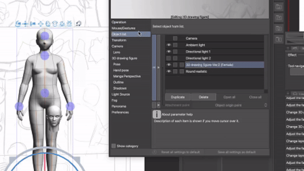 Enfin, nous devons combiner le corps et la tête. Pour ce faire, ouvrez la fenêtre des préférences (Détail de sous-outil) et accédez à l'onglet Liste des objets. Vous pouvez y attribuer un objet parent en faisant glisser un modèle 3D sur l'autre. Vous pouvez également spécifier le point d'attache.Cela facilitera le positionnement ultérieur. Après cela, nous pouvons légèrement ajuster la position et la taille de la tête jusqu'à obtenir un ajustement parfait.