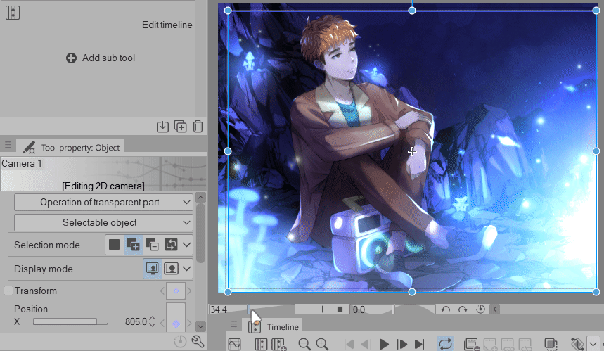 Vous pouvez développer vos transformations de caméra dans la ligne de temps ou vous pouvez utiliser la Propriété d'outil Opération > Objet