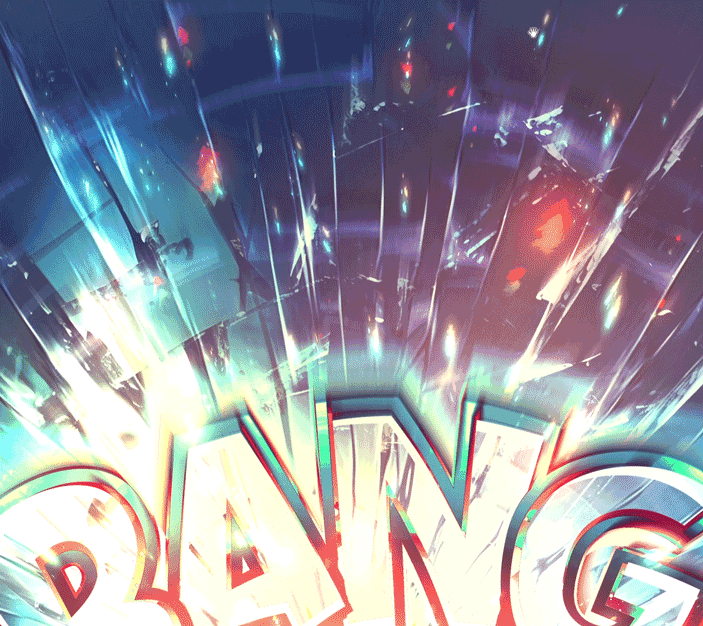 背景は、多数の画像、稲妻ブラシ、パーティクル、そしてこれらのレイヤーのぼかしコピーを様々なブレンドモードで重ねて作成しました。
