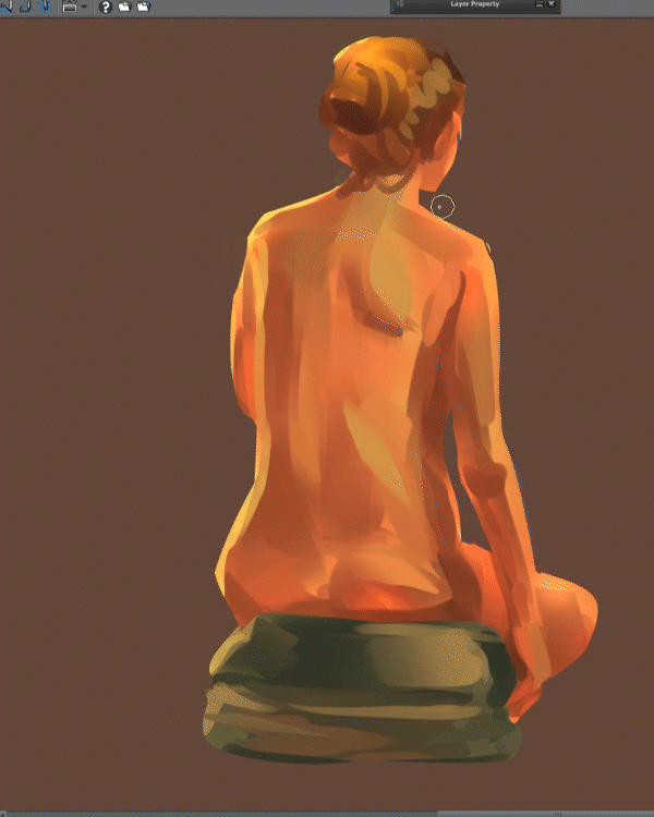 合成モードを持つブラシや混色は単一のレイヤー内でのみ機能することに注意してください。つまり、この場合、背景を除いて、人物は形状を保つために透明部分がロックされた単一のレイヤーに描かれています。