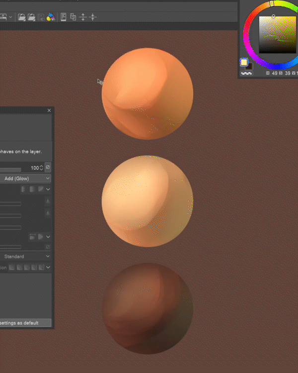 メインの光には、光源の色を選び、加算(発光)ブラシを使用します。