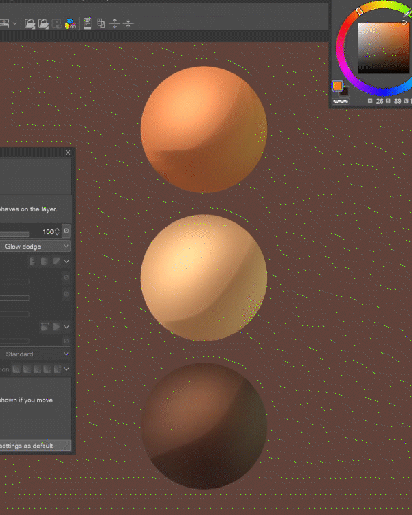 周囲の物体から反射した光や、絵により多くの色のバリエーションを加えるには、覆い焼き(発光)、オーバーレイ、彩度ブラシを使用できます。