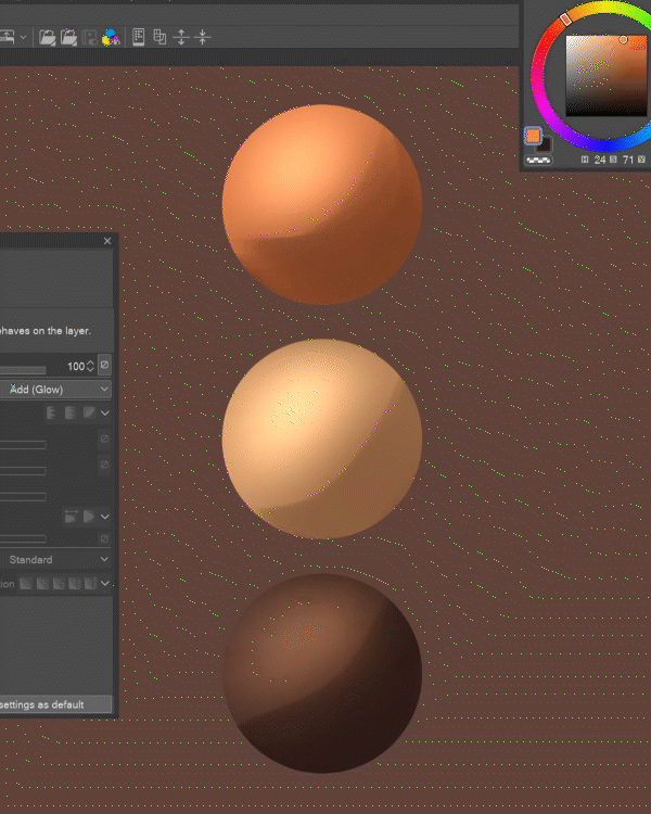 私は、特に加算(発光)、覆い焼き(発光)、彩度、乗算など、最もよく使う様々な合成モードを持つデフォルトのソフトブラシのセットを作成しました。