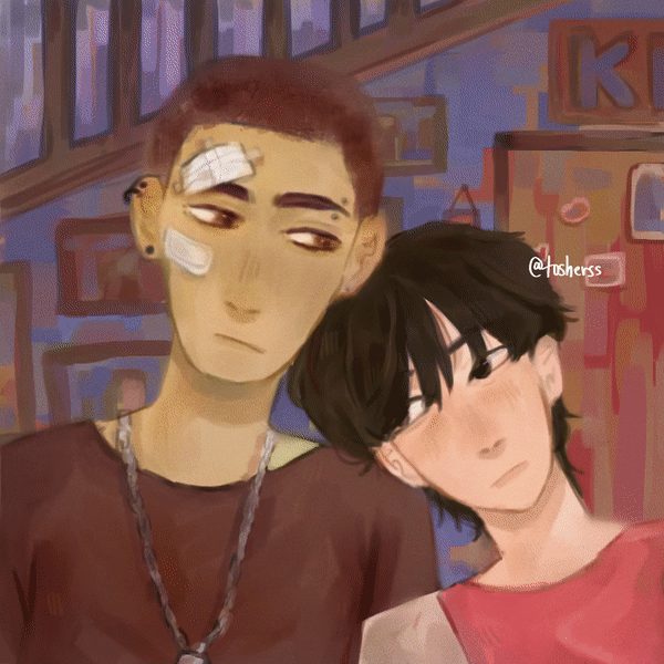 キャラクターについては、不透明度50%の焼き込みカラーレイヤーから始めました。このレイヤーで、太陽光が当たるであろう領域に光を追加し、背景にアプローチしたのと同様に、あまり光が当たらない領域には少し茶色も追加しました。次に、くすみ感を減らし、キャラクターに少し「輝き」を与えるために、覆い焼きカラーを使用して肌の周りの領域を明るくしました。同じレイヤーで、エッジが柔らかく、光が明るすぎないように注意しながら光を追加しました。最後に、乗算レイヤーで、髪、ピアス、チェーンなどの下部に落とし影を追加しました。また、黒髪のキャラクターの髪の周りも、直射日光が当たらないためエアブラシで描きました。