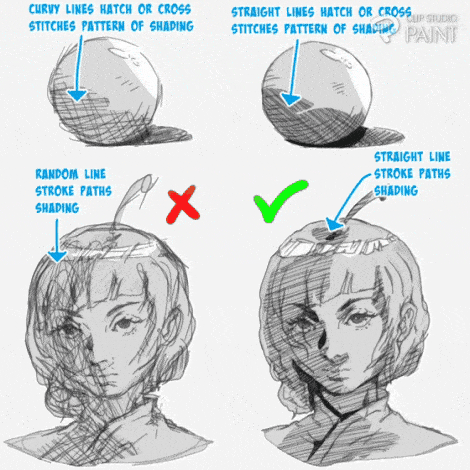 直線のハッチング ライン (クロス ステッチ パターンとも呼ばれます) などの線を使用して対象に影を追加することもできます。または、右側のように直線の対角線を追加し、左側の線を避けることもできます。ランダムに曲線を描きます。