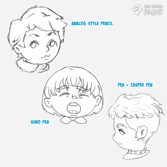 また、上記の複数のスタイルのサブツール ブラシは (鉛筆サブツール) にも見られますが、ペンとは異なり、このサブツールのセットはノイズが多く、硬く見える傾向があり、以下に示すように先端がランダムに移動することがあります。