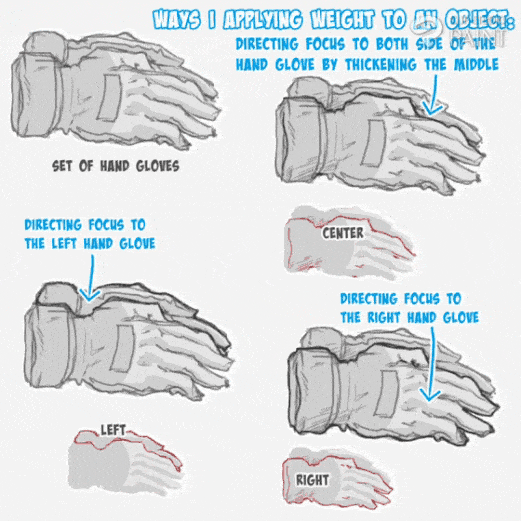 そして、主題をさらに表現することで、芸術家が視聴者に何に焦点を当ててほしいかを示すのに役立ちます。たとえば、両手に手袋を重ねて片方をもう片方に重ねている場合、手前の手袋を強調点にしたい場合、または焦点を合わせるには、以下に示すように、輪郭線を太くし、閲覧者の焦点を特定のものに引き寄せるだけです。