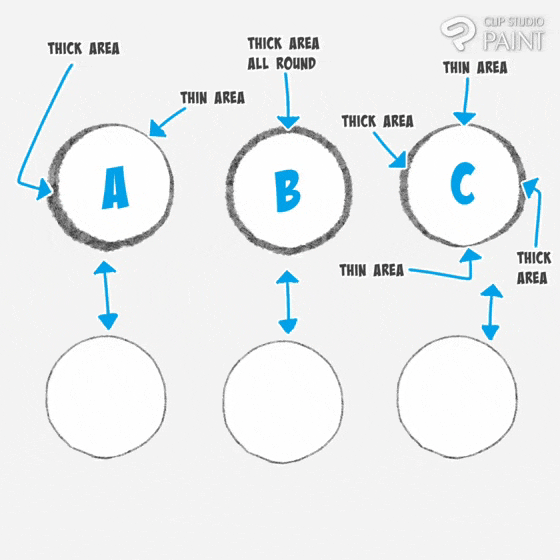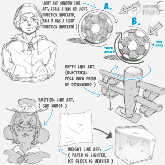 通常の線画のビルドアップには、線画にどのように圧力を加えるかが関係します。これは、被写体の描画と、それが視聴者に伝えたいストーリーの観点から考慮すると、たとえば線を細くすると、視聴者に「被写体の重さが軽い場合、厚いまたは密な場合は、被写体の重さが大きいことを示します。また、線の密度が濃い線と薄い線が混在する線画は、どの角度から光が当たっているかを鑑賞者に伝えます。