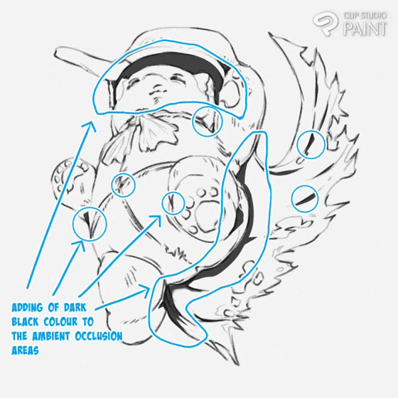 さらに、以下に示すように、直射光によって作成される暗い影を避ける領域であるアンビエント領域に暗い黒色を追加することもできます (スーパー フライ パンダの線画、ボール、女性キャラクター)。