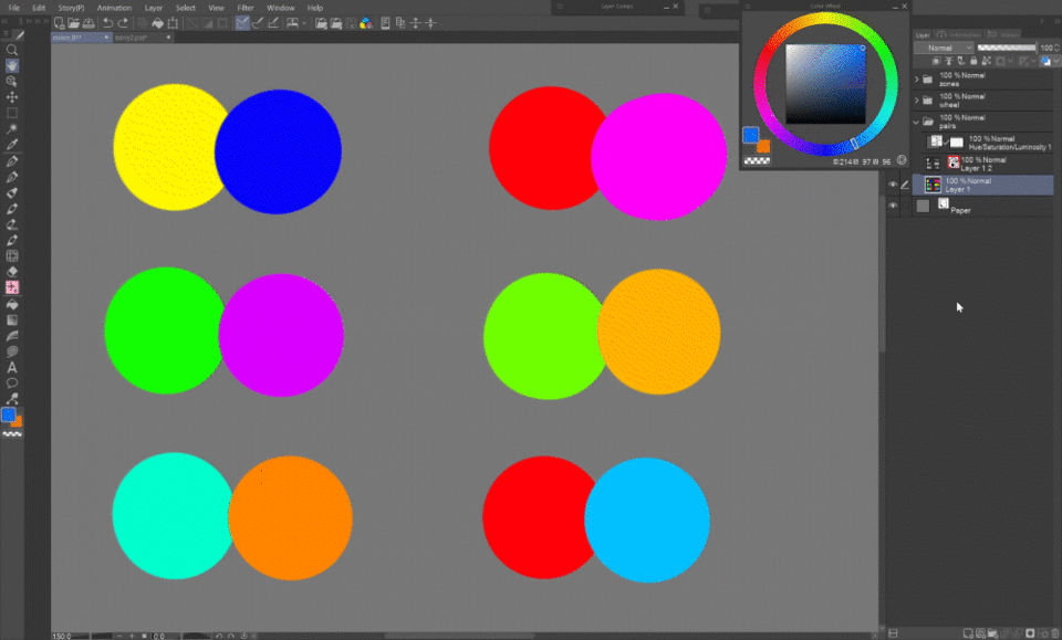 CSPのカラーホイールパレットは、色を選ぶだけでなく、色彩理論を知らなくてもどの色を使えばいいか決めるのに役立つように設計されています!