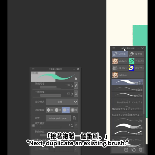 "다음으로, 기존 브러시를 자유롭게 복제합니다." 다음으로, 기존 브러시를 자유롭게 복제합니다.