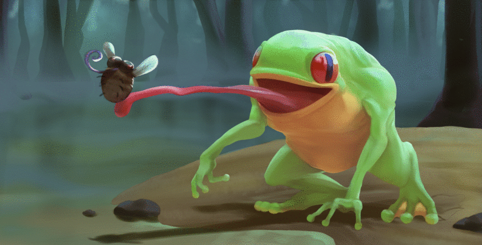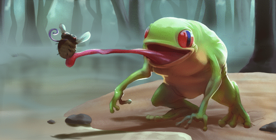 작품에 움직임을 부여하는 효과를 이미지에 구현했습니다. 예를 들어 개구리 혀의 침과 파리의 날개 펄럭임을 그리는 것입니다. 이는 날개를 복제하고 회전시킨 다음("편집 > 변형 > 회전") 모션 블러 필터("필터 > 흐리게 > 모션 블러")를 적용하여 이루어집니다.