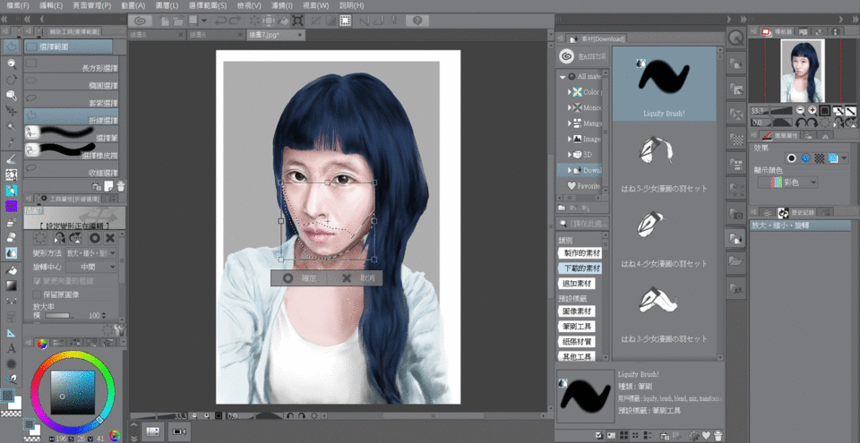 2. [페인팅] 브러시는 얼굴 형을 다시 잡고 머리카락을 수정하고 빈자리를 채 웁니다. [액체 브러시]는 큰 공석을 채우는 데 도움이됩니다.