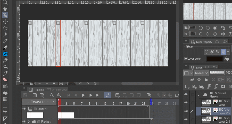 다리에 대한 6개의 모듈을 별도의 파일로 그린 후, 클립 스튜디오의 키프레임 활성화 기능을 사용하여 루프를 애니메이션화합니다. 완벽한 루프를 위해 6개의 목재 모듈을 포함하는 폴더 바깥에 있는 사각형 중 하나를 복사합니다. 이것은 고정되어 사이클의 끝에 완벽한 위치에 있습니다. 키프레임 활성화가 되면, 빨간색 참조와 일치하도록 폴더를 이동합니다. 그림을 이동하려면 드래그하거나 화살표를 사용할 수 있습니다. 이 부분에 색상 텍스처를 칠했지만 너무 복잡하여 이 기술의 다음 부분에서는 보이지 않는 것이 좋습니다.