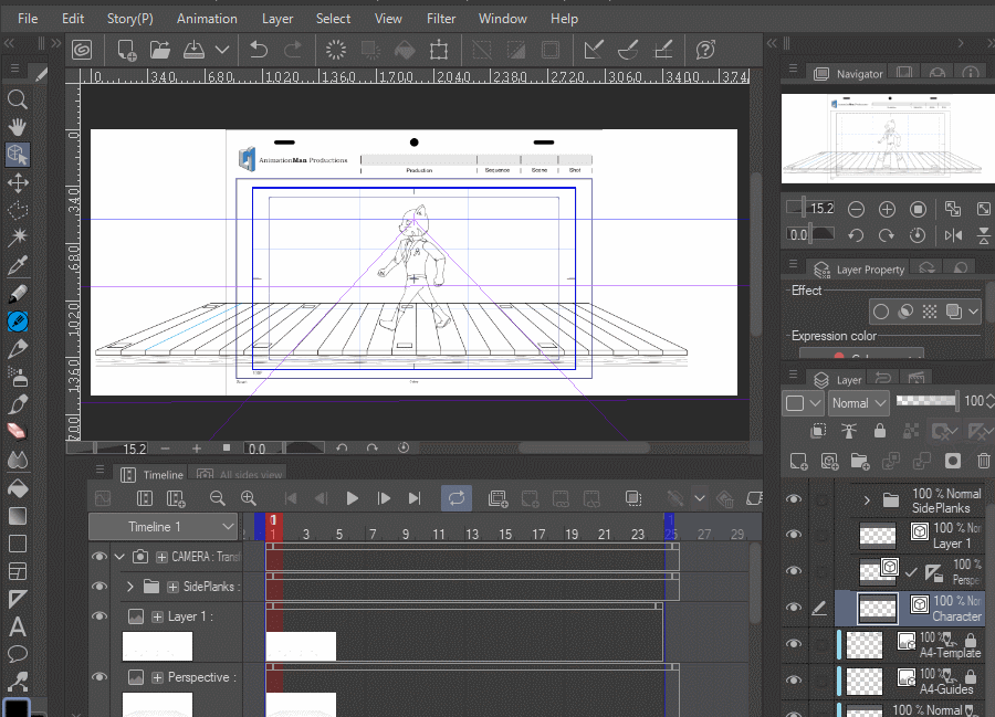 초기 예시를 위해 24프레임 애니메이션 루프를 만들었으며, 아래 이미지는 캐릭터가 걷게 될 환경을 보여줍니다. 1점 투시를 사용하여 다리를 그렸으며, 이것이 전체 루프에 대한 참조가 될 것입니다.