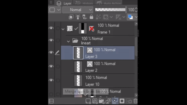 이제 선화 작업이 끝났습니다. 저는 레이어 수를 제한하기 위해 가끔 레이어를 결합합니다. "아래 레이어와 결합" 아이콘을 클릭하여 이 작업을 수행할 수 있습니다. 이렇게 하면 현재 레이어가 아래 레이어와 결합됩니다.