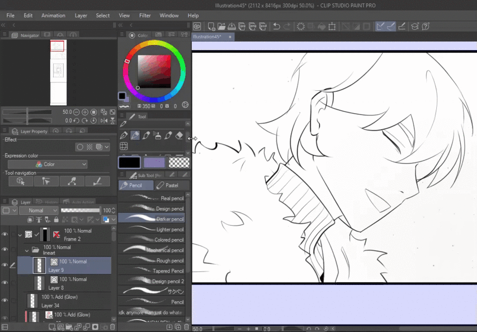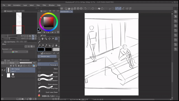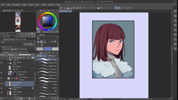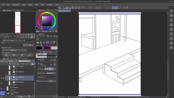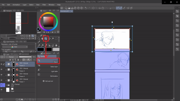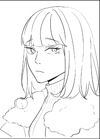 이것은 선화에 벡터 레이어를 사용하는 몇 가지 이점입니다. 그래서 저는 테두리 프레임 안에 벡터 레이어를 만들고 초안 폴더의 불투명도를 낮춘 다음 선화를 그리기 시작할 것입니다.