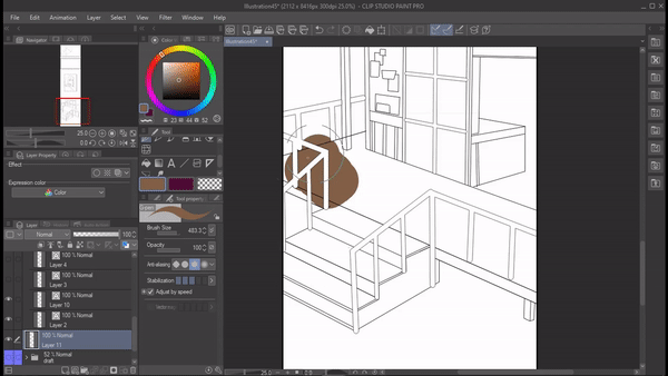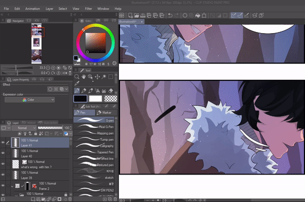 레이어 팔레트를 나누어 레이어를 두 개의 창에 표시하는 기능입니다. 이 기능은 레이어가 너무 많고 두 레이어 사이를 앞뒤로 이동하고 싶을 때 유용합니다. 이제 위아래로 스크롤할 필요 없이 플랫 색상 레이어와 선화 레이어에서 작업할 수 있어 과정이 빨라집니다.