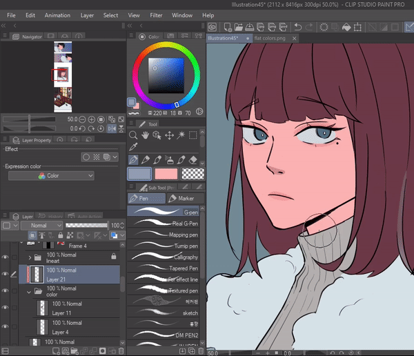 이제 플랫 채색에 사용하는 펜 도구를 선택합니다. 저는 기본으로 제공되는 G펜을 사용합니다. 이제 [펜 설정] > [흐름 방지] > [참조 레이어 넘지 않음]을 활성화하면 색상이 참조된 선을 벗어나지 않도록 할 수 있습니다.