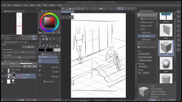 마지막 패널에 배경을 그려야 합니다. 저는 원근법에 도움이 되도록 배경에 3D 프리미티브를 사용하는 것을 선호합니다. 클립 스튜디오 페인트를 업데이트했는지 확인하세요. 그렇지 않으면 3D 프리미티브를 찾을 수 없습니다.