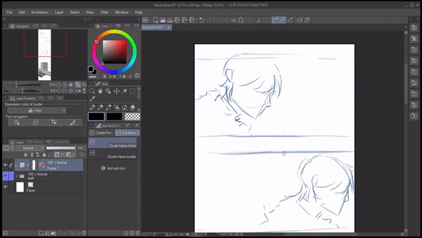 테두리 프레임은 만화 패널을 만드는 데 사용할 수 있습니다. 테두리 프레임 레이어는 캔버스 기본 테두리에 맞춰 새 프레임 테두리 폴더를 만들며, 이를 편집하고 이동할 수 있습니다. 프레임 테두리 폴더를 사용하면 각 만화 프레임에 대해 레이어를 개별적으로 관리할 수 있습니다.