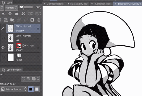 시작하기 전에 클립 스튜디오 페인트의 톤에 대한 기본적인 사항을 설명하겠습니다. 톤을 디지털로 적용하는 방법은 여러 가지가 있지만, 저는 주로 레이어 속성을 사용합니다. 재료를 드래그하거나 선택 도구를 사용하는 것보다 저에게는 가장 쉬운 방법이기 때문입니다.